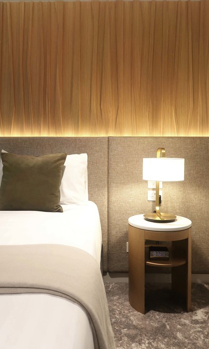 The timber bedhead brings the idea of the elm trees at the front of the property into the rooms.